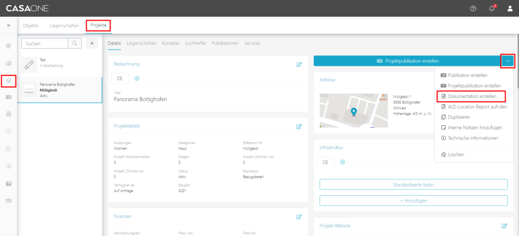 Klicken Sie in unter „Objekte“ in der Subnavigation auf Projekte und wählen Sie das entsprechende Projekt aus, für das Sie eine Dokumentation erstellen möchten. Klicken Sie dann rechts neben die Hauptaktionstaste, um die Optionen anzuzeigen. Klicken Sie im erscheinenden Menü auf „Dokumentation erstellen“ und stellen Sie dann die verschiedenen oben erläutertenOptionen ein. CASAONE erzeugt dann das Dokument und Ihr PDF wird auf Ihren Computer heruntergeladen.