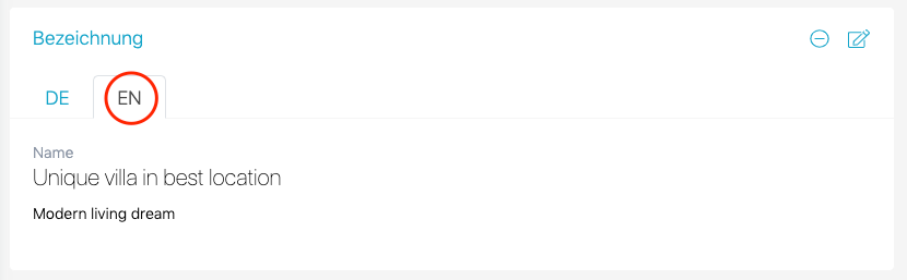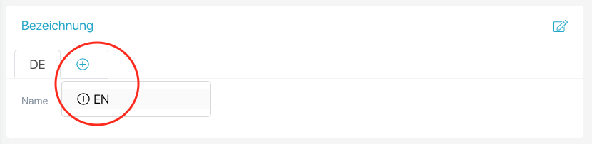 Gehen Sie für das Erfassen eines Objektes in einer bestimmten Sprache zum Menüpunkt Details zur Rubrik Bezeichnung und klicken Sie auf das+-Symbol im Register. Wählen Sie dann die gewünschte Sprache.