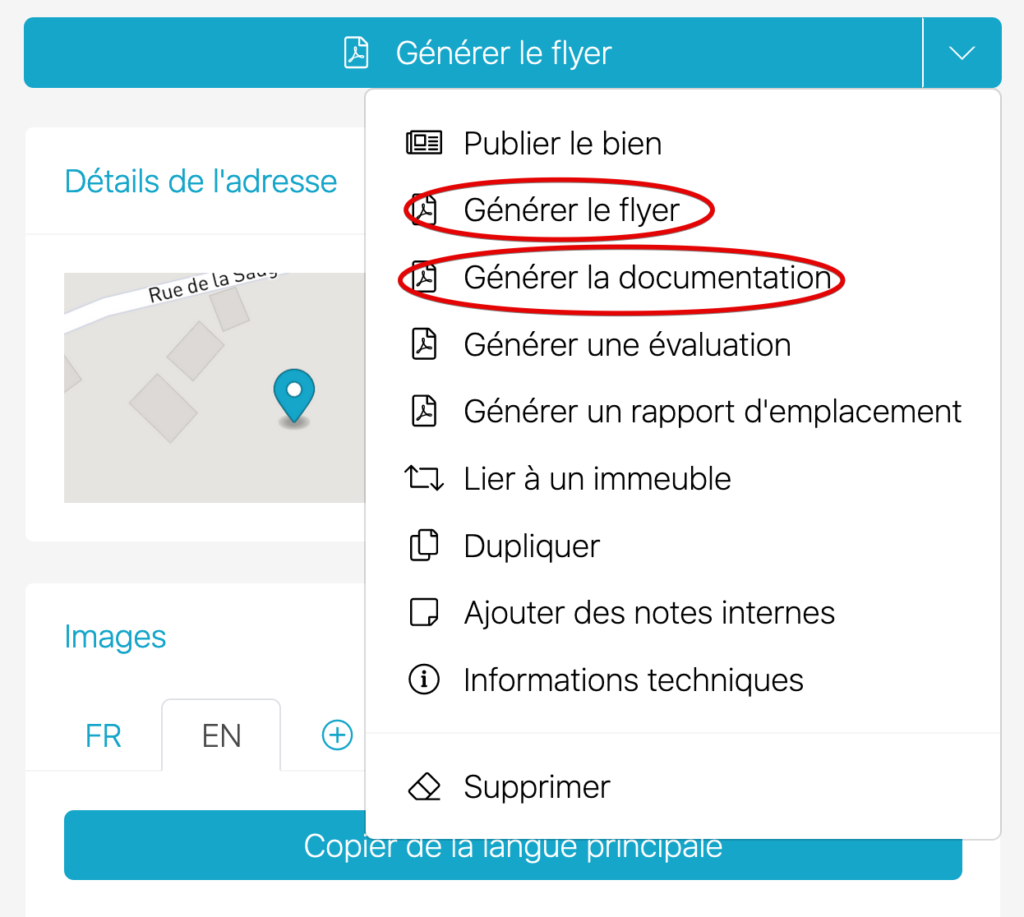 Hinweis: Damit Flyer oder Dokumente für ein Objekt in einer bestimmten Sprache generiert werden können, muss das Objekt bereits in derjenigen Sprache erfasst sein.
