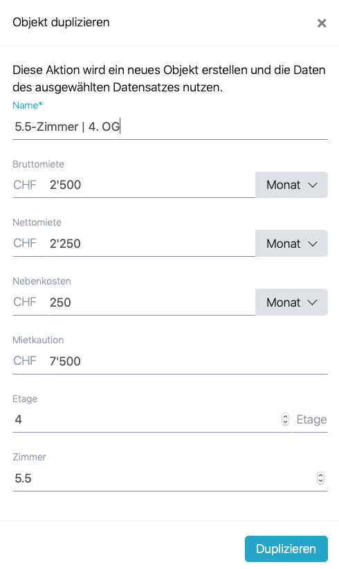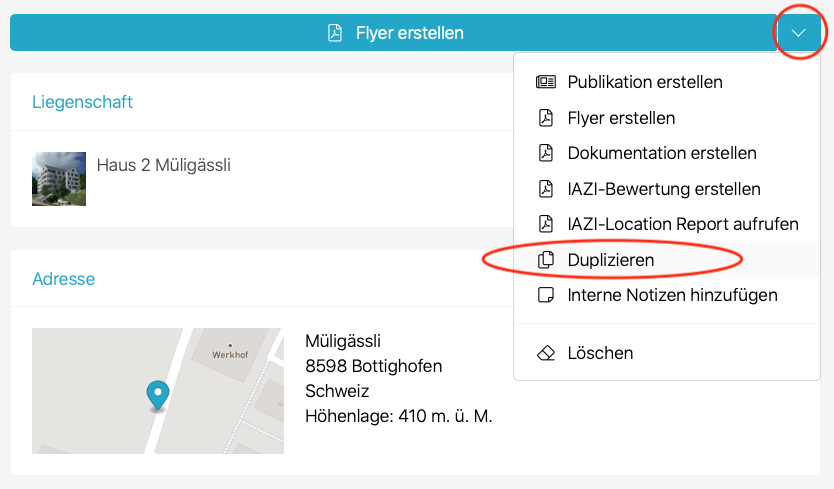 Tipp: In der Regel unterscheiden sich Objekte innerhalb einer Liegenschaft nur durch wenige Eigenschaften wie z.B. Etage, Grösse oder Preise. Sie können deshalb ein erfasstes Objekt duplizieren und die wenigen Parameter objektspezifisch anpassen. Klicken Sie dazu in der blauen Aktionsleiste auf den Pfeil rechts und dann im Dropdown-Menü auf Duplizieren.