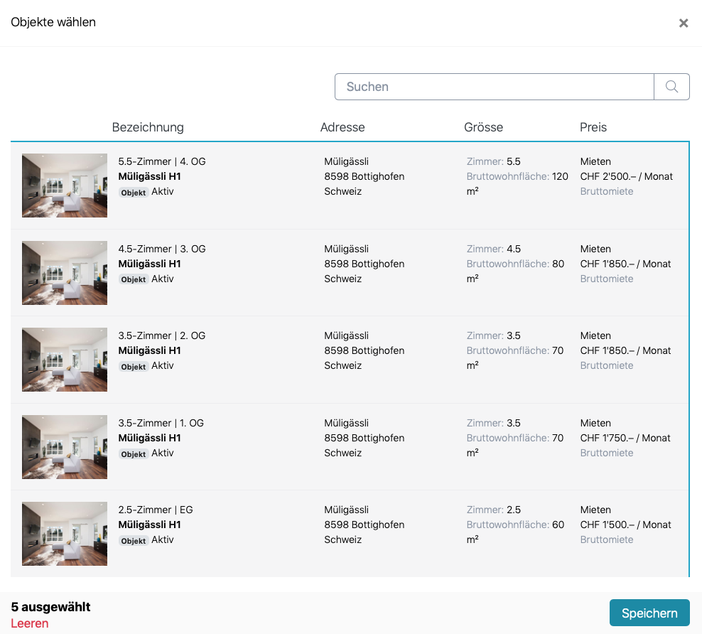 - Markieren Sie die entsprechenden Objekte, welche Sie der Liegenschaft hinzufügen wollen und klicken Sie auf Speichern.
