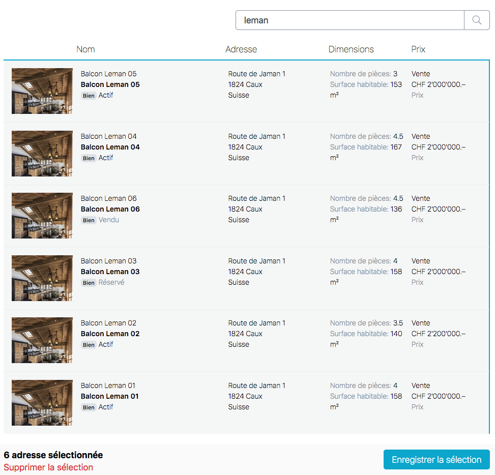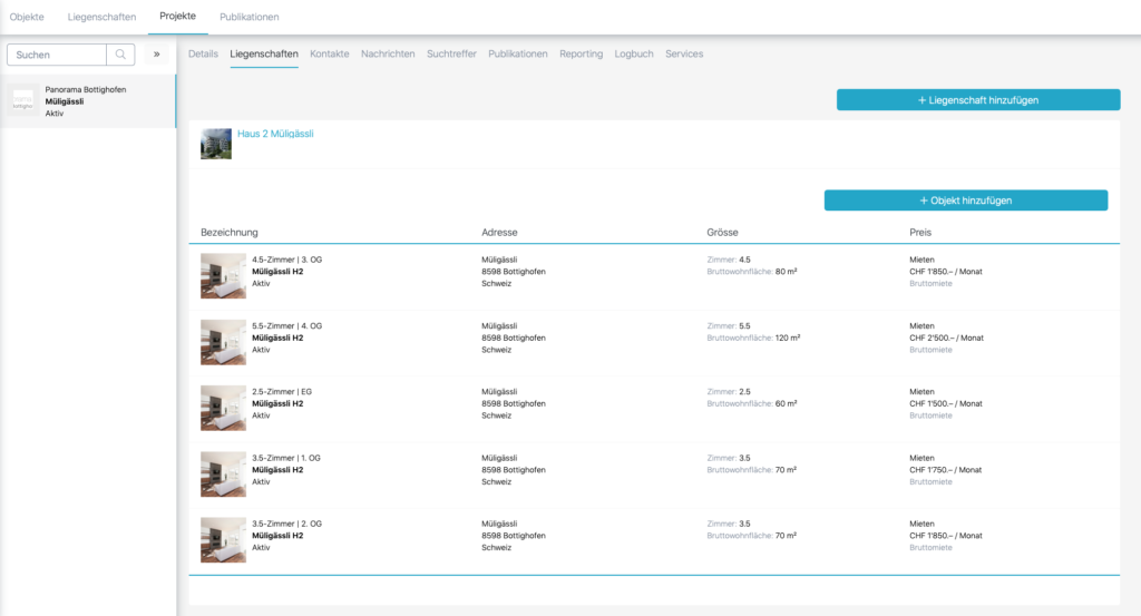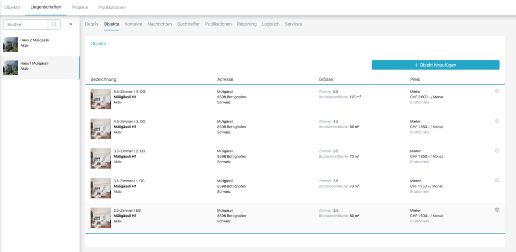 Unter Liegenschaften im Menüpunkt Objekte, sehen Sie alle hinzugefügten Objekte zur Liegenschaft.