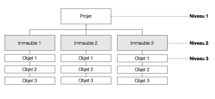 Wenn Sie ein Projekt verwalten, resp. vermarkten wollen, können Sie Objekte einer Liegenschaften zuweisen und eine Liegenschaft einem Projekt. Beispielhafter Aufbau eines Projektes: