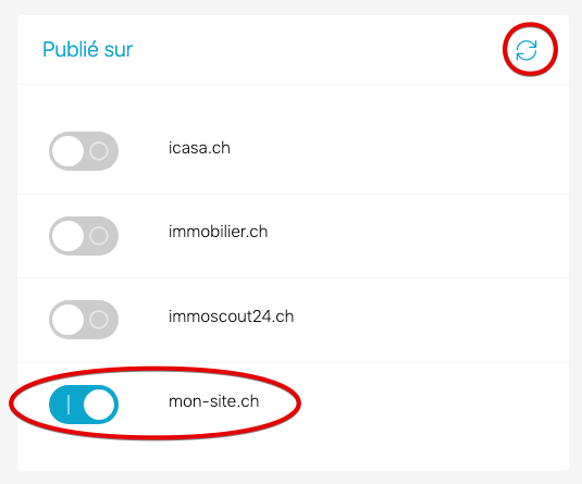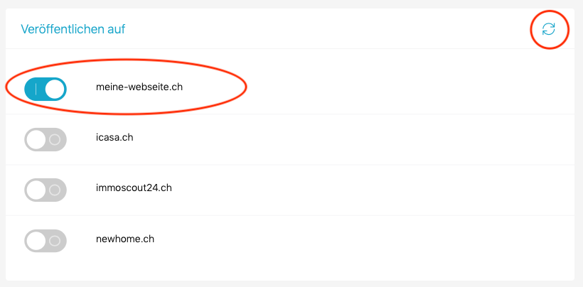 Erstellen Sie für das Objekt eine Publikation. Aktivieren Sie nur den Regler für Ihre Webseite und drücken Sie auf das Symbol zum aktualisieren der Portale.