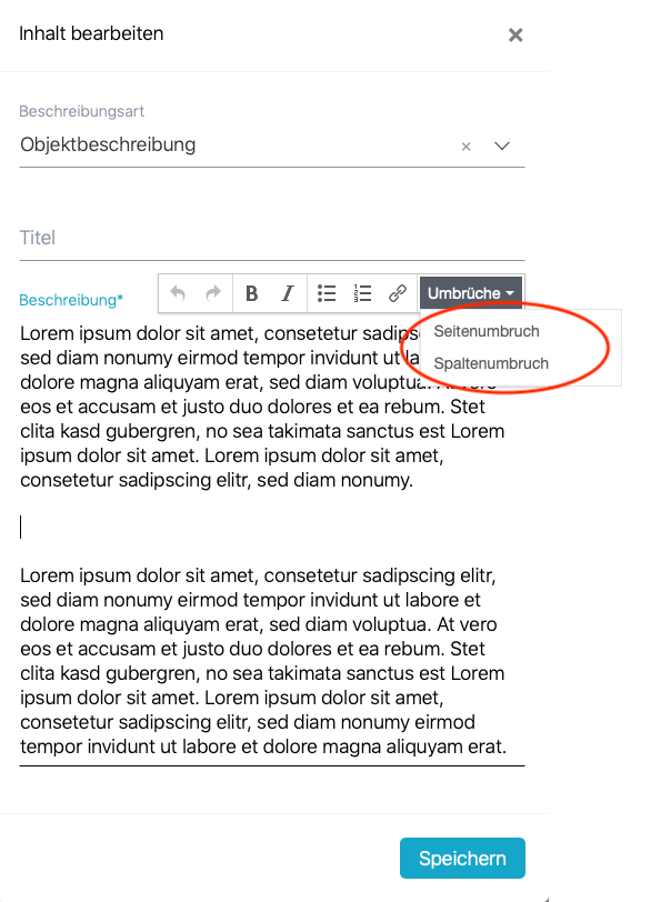 Bei längeren Beschreibungstexten lassen sich individuelle Seiten- und Spaltenumbrüche einfügen. Wählen Sie dazu die gewünschte Beschreibungsart in der Rubrik Beschreibungen aus und klicken Sie in den Text. Das Texteditor-Feld öffnet sich. Klicken Sie auf Umbrüche.