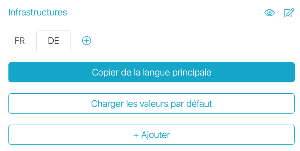 Nachdem Sie die Daten für die Hauptsprache erfasst haben, können sie diese mit einem Klick aufVon Hauptsprache übernehmen auch für die weiteren Sprachvarianten verwenden. Klicken Sie dafür auf das entsprechende Sprachregister bei der Infrastruktur-Karte.