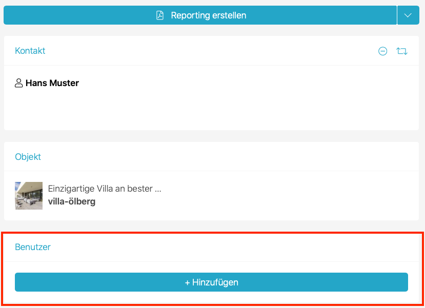 2. Klicken Sie beim entsprechenden Objekt im Menüpunkt Reporting in der Rubrik Benutzer (rechte Kolonne) auf den Button+ Hinzufügen.