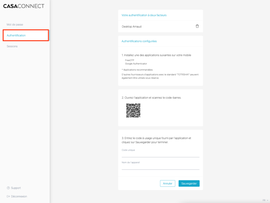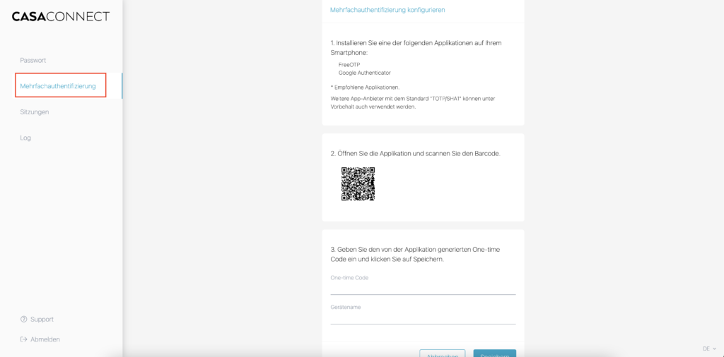 Um die Zwei-Faktor-Authentifizierung auf Ihrem CASAONE-Konto zu aktivieren, müssen Sie eine Authentifizierungs-App wie z.B. Google Authenticator, usw. auf Ihrem Smartphone installiert haben.