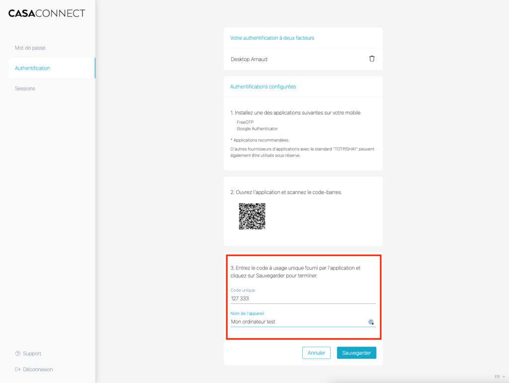4. Wenn Sie dies getan haben, geben Sie den einmaligen Code, den Sie von der App erhalten haben, in das Feld „One-time Code“ auf CASAONE ein und geben dem Gerät einen Namen.