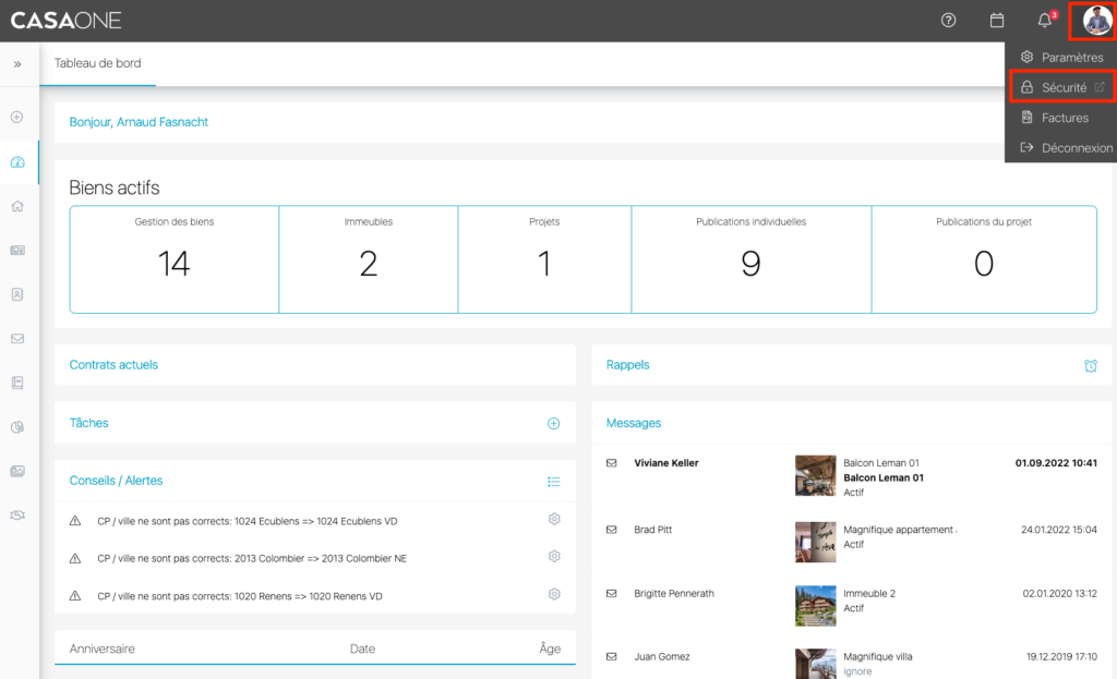 1. Wenn Sie in Ihr CASAONE-Konto eingeloggt sind, gehen Sie ganz oben rechts auf das Benutzersymbol und klicken Sie dann auf den Reiter „Sicherheit“.