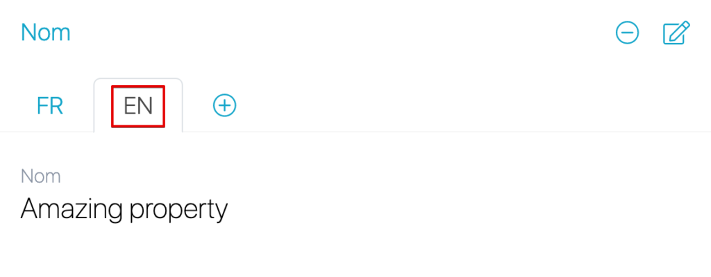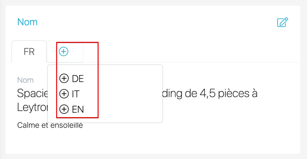 Allez dans Gestion des biens puis dans les détails sous le Nom cliquez sur le symbole+. Sélectionnez la langue souhaitée.