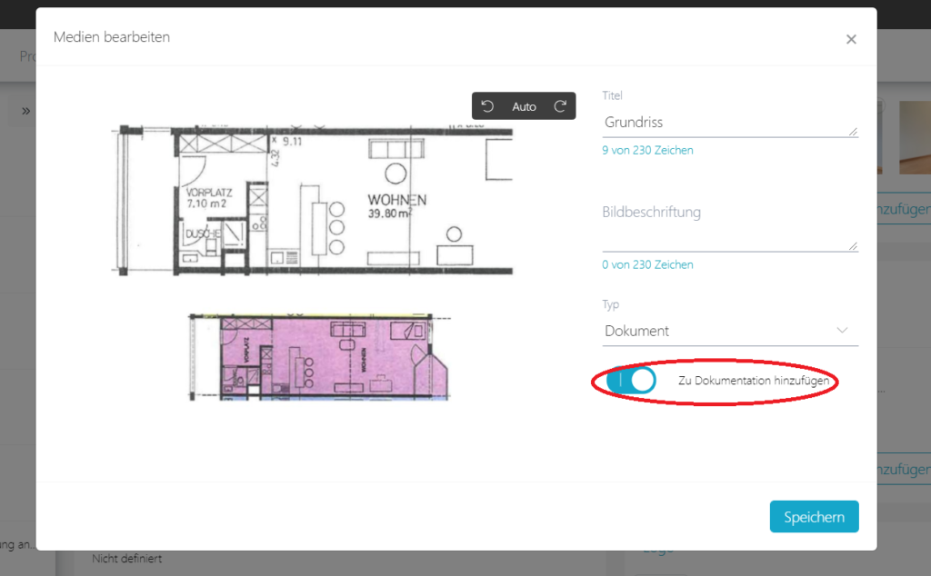 Par défaut, aucun des documents (plans, etc…) ajoutés dans votre objets ne sont affichés dans la documentation. Pour ajouter des documents à la documentation, vous devez manuellement activer les documents souhaités. Pour ce faire, cliquez sur la roue dentée à côté du document en question puis cliquez sur « Modifier ». Activez ensuite « Attacher à la documentation ».