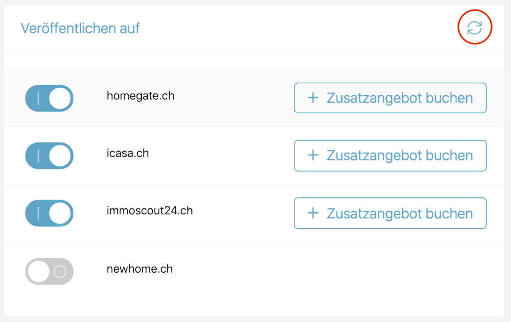 - Contrôlez que vous avez bien activé les différents portails souhaités. Pour cela, déplacez le bouton à côté des portails à activer. Ensuite, cliquez sur les 2 flèches formant un cercle afin d'actualiser les portails. En fonction du portail, cela peut prendre jusqu'à 1,5 heures pour que votre objet soit publié.