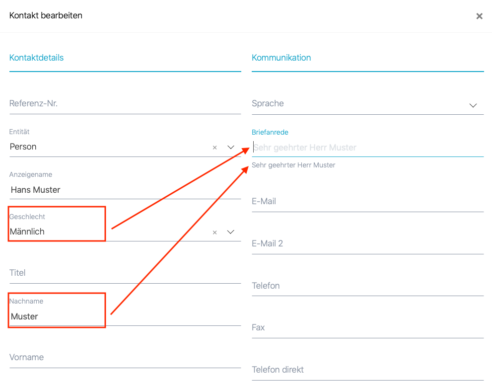 Si le genre ainsi que le nom sont saisis, la formule de politesse Cher Monsieur XY est générée.