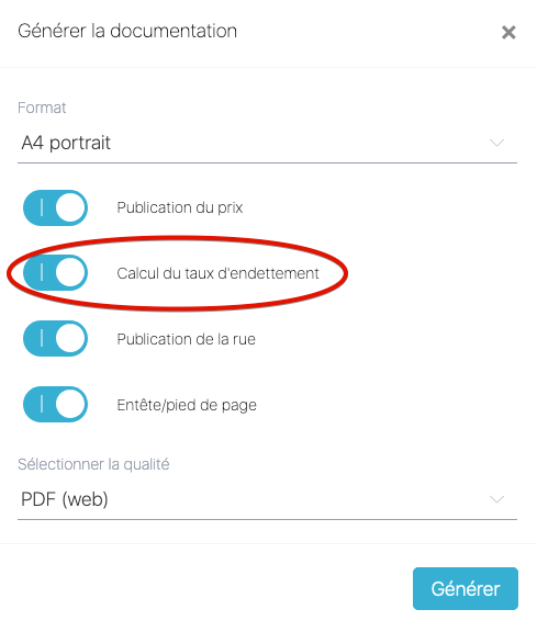 Choisissez l'objet en vente qui est concerné. Cliquez sur le bouton d'action principal puis sélectionnez Générer la documentation. Un popup s'ouvre. Activez l'option calcult du taux d'endettement.