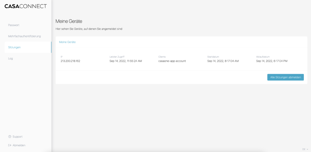 5. Votre compte est maintenant sécurisé par l’authentification à double facteur. Dans le menu, sous „Sessions“ vous pouvez en tout temps voir quelles sessions sont actives et les supprimer en cas de besoin