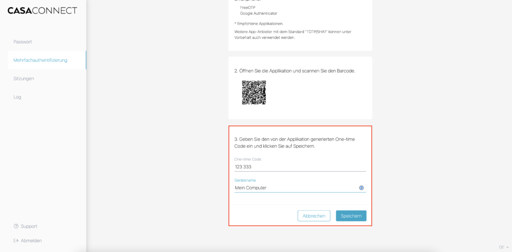 4. Une fois effecuté, indiquez le code unique que vous donne l’app dans le champs „Code unique“ sur CASAONE et donné un nom à cet appareil.