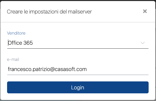 4. Fai clic su "Aggiungi" per creare la nuova configurazione. Nella finestra che appare, seleziona Office 365 nel campo Venditore, quindi inserisci l'indirizzo e-mail, il quale desideri utilizzare per scrivere da CASAONE, nel campo Email e fai clic su Log in.